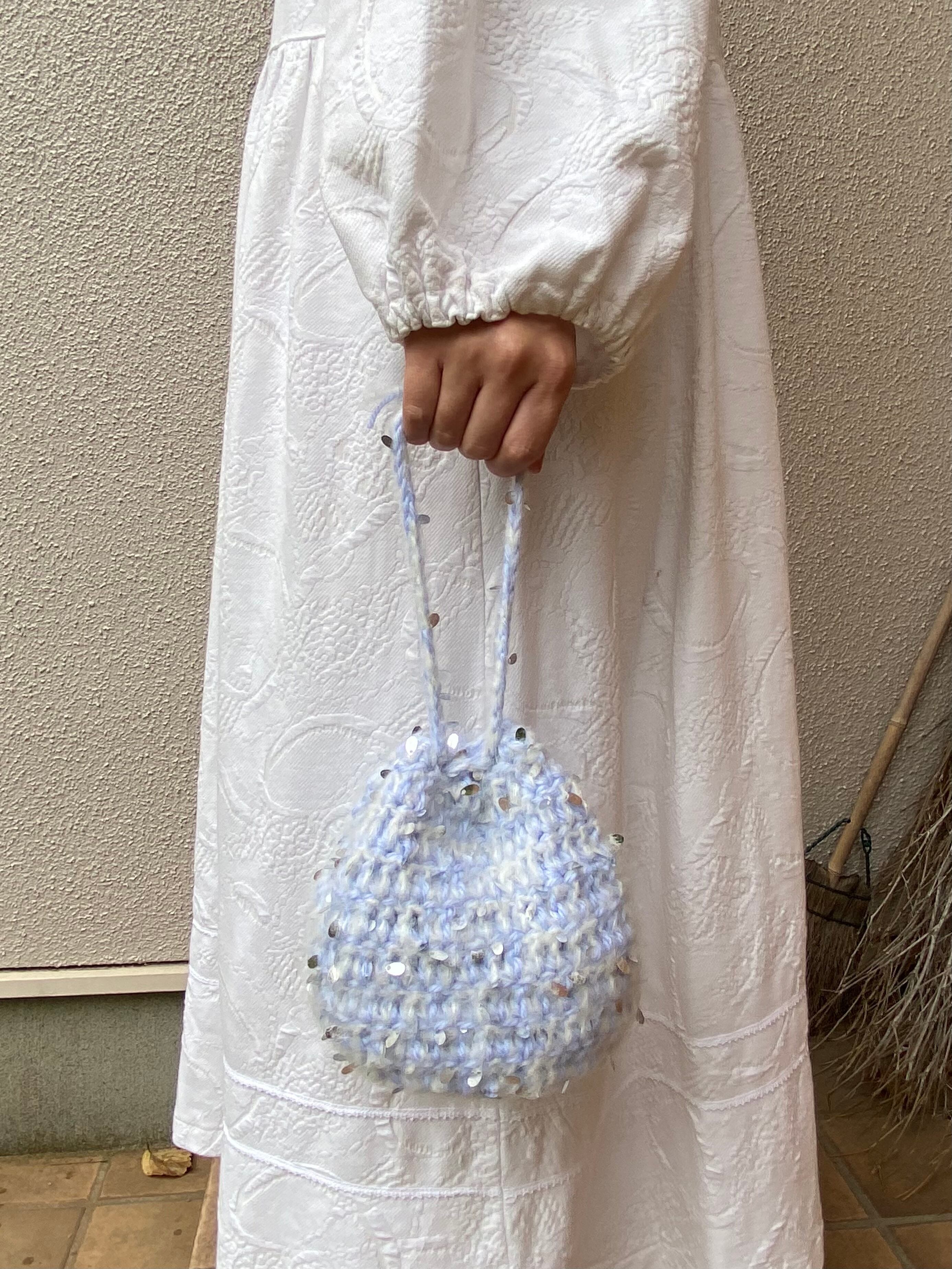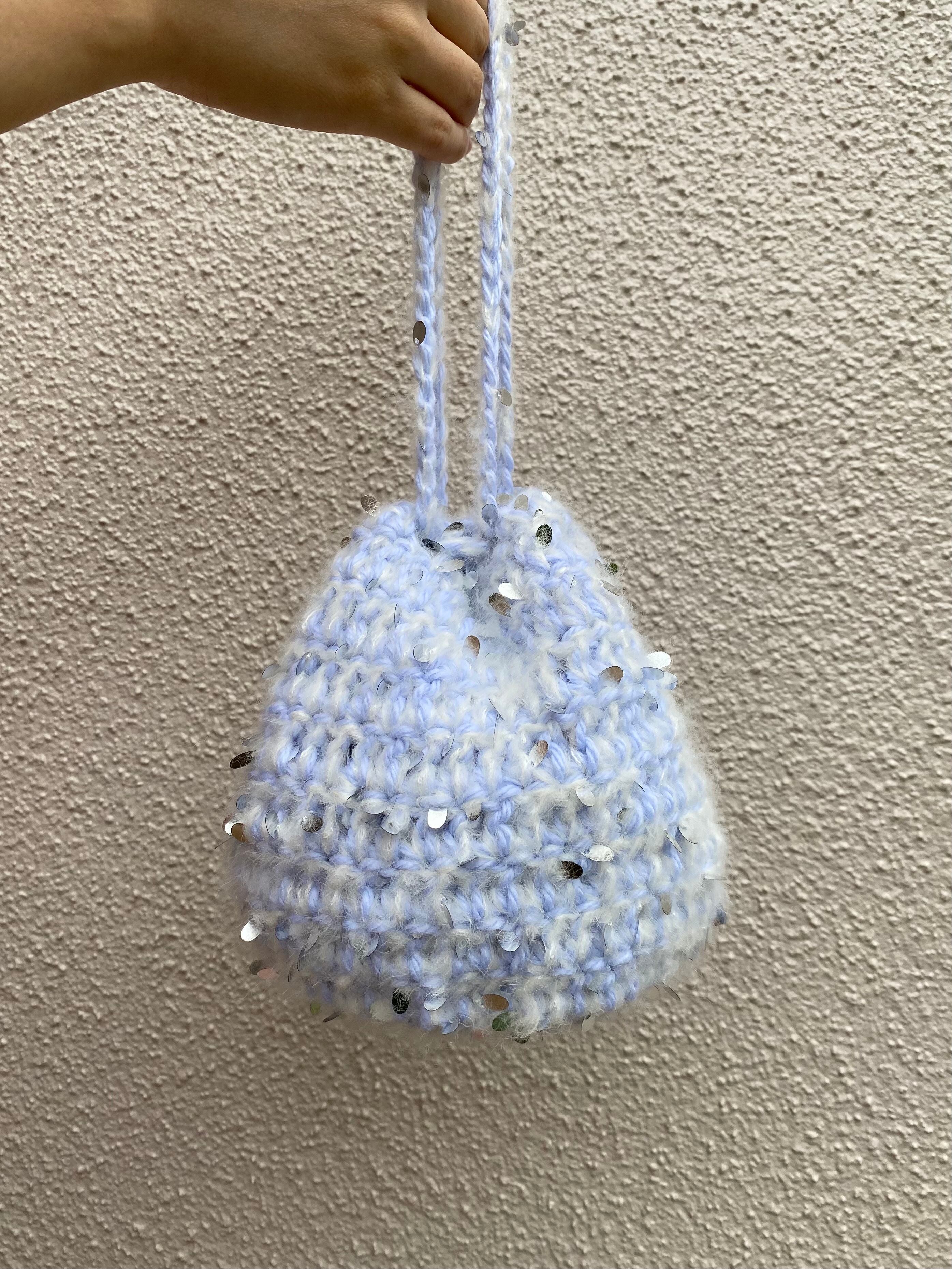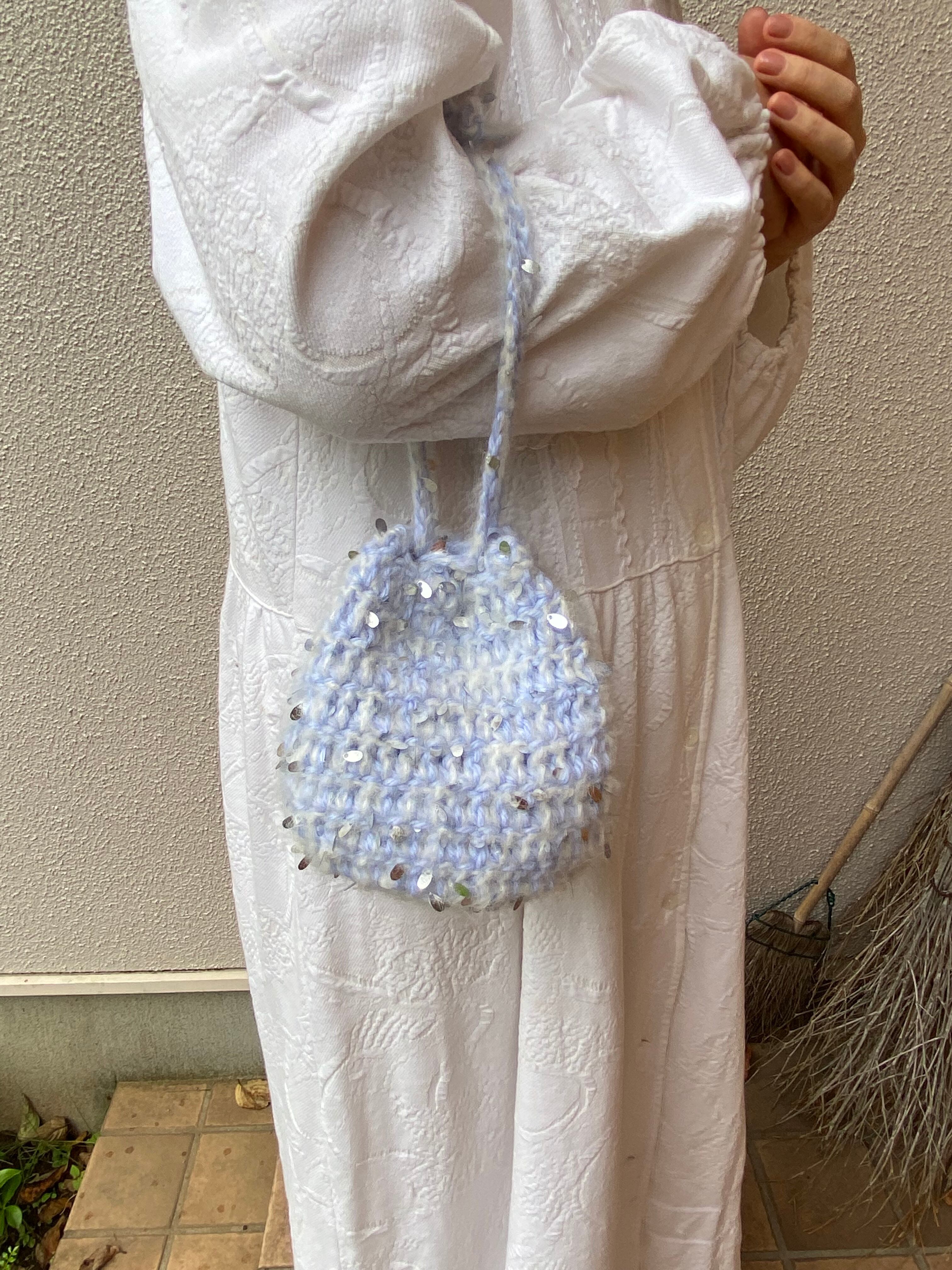 スパンコールが散りばめられた可愛いモヘアとブルーの毛糸で編んだモコモコ巾着❤︎