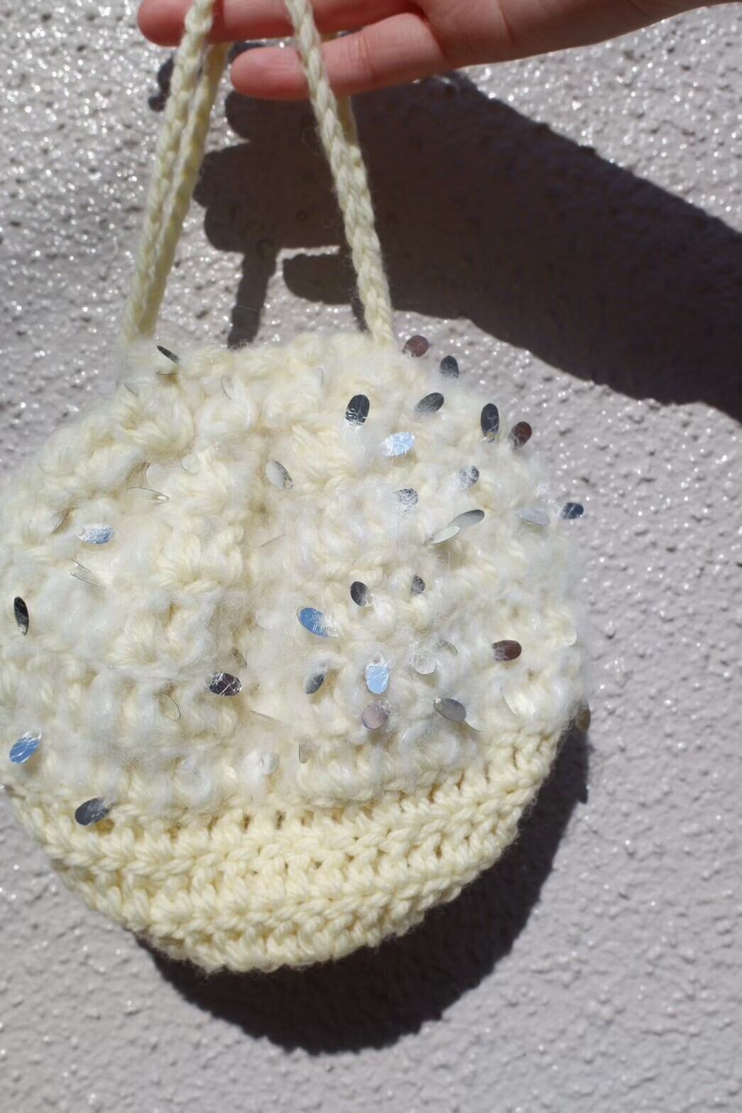 スパンコールが散りばめられた可愛いモヘアとベビーイエローの毛糸で編んだモコモコ巾着❤︎