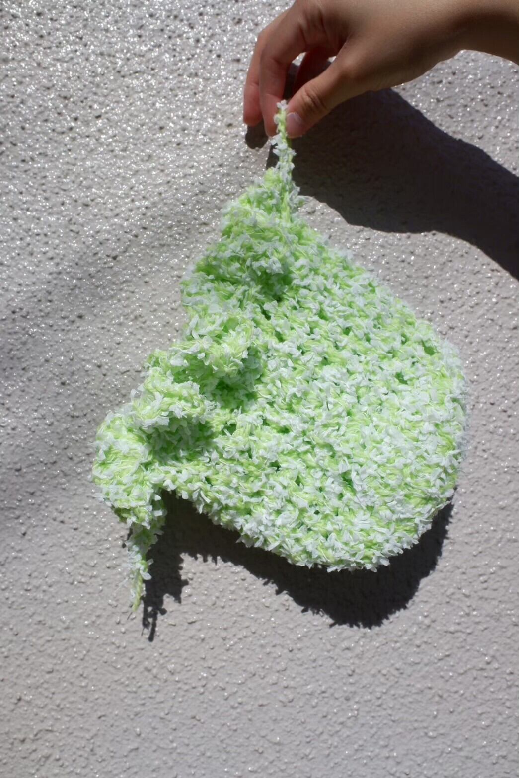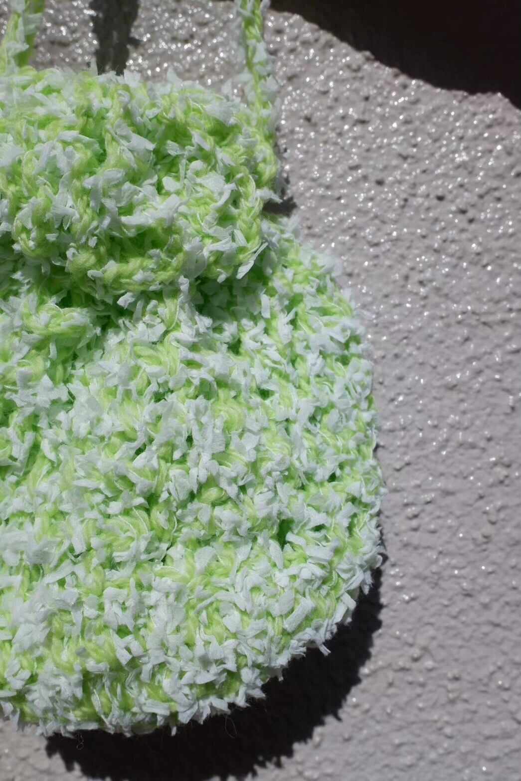 きみどりの毛糸とフリフリとした毛糸で編んだ巾着!